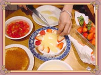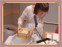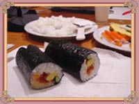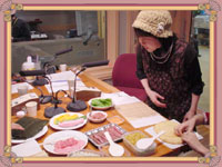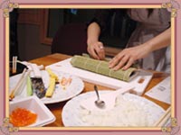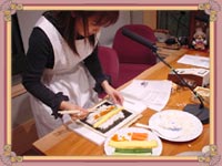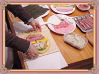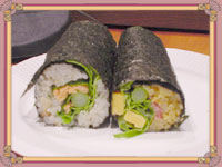 -------------------- 2005年1月27日 -------------------- ゲストの佐久間紅美さんと節分用に太巻き作り。 赤、黄、緑のご飯、ローストビーフ、コーンやチーズといった食材を のりやクレープ生地で巻きます。カリフォルニアロール風。 |