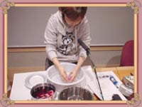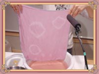 -------------------- 2003年11月20日 -------------------- やってきました!ボジョレー解禁! 今年は乾杯するだけではありません。ワイン染めに挑戦! しぼり染めの要領で、ハンカチを絞って輪ゴム(もしくは糸)でしばります。 それを、ワインに漬けて煮込むこと約20分。軽く洗って広げてみると…… しばったところに見事な◎模様が! できあがったハンカチは、お客様にプレゼントさせていただきました。 |