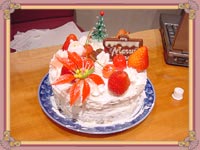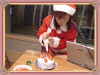-------------------- 2002年12月19日 -------------------- クリスマス前の放送、テーマは「クリスマスに必要なもの」 ということで、店主がサンタさんの衣装でクリスマスケーキを作りました! スポンジケーキにいちごや桃などのフルーツをはさみ、 生クリームやチョコレートでデコレーション。 初めてのケーキ作りに、大満足なのでした。 |