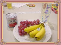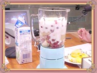 -------------------- 2002年10月24日 -------------------- ゲストの“みっくすJUICE(中原麻衣さん、植田佳奈さん、 斎藤千和さん、森永理科さん)”に 材料を持ち寄っていただいて「ミックスジュース」をつくりました。 麻衣ちゃんがぶどう、佳奈ちゃんがバナナ、千和ちゃんがさわやかレモン汁、 理科ちゃんが桃の缶詰、そしてねじまき堂から牛乳。 実にまろやかでとても美味しかったです! |