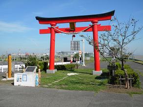 赤煉瓦堤防に沿って河口に下ると、大鳥居がドカーンと現れます。これは穴守稲荷の大鳥居で建立当時の場所に立ち続けていることになります。鳥居に向かって立つと、その奥は羽田空港の国際線ターミナル!なかなかの絶景ですな。