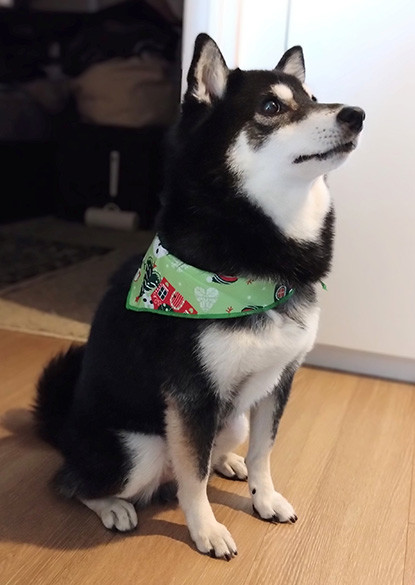 さて今回も紋次郎。「クリスマス柄、つけてもらった」