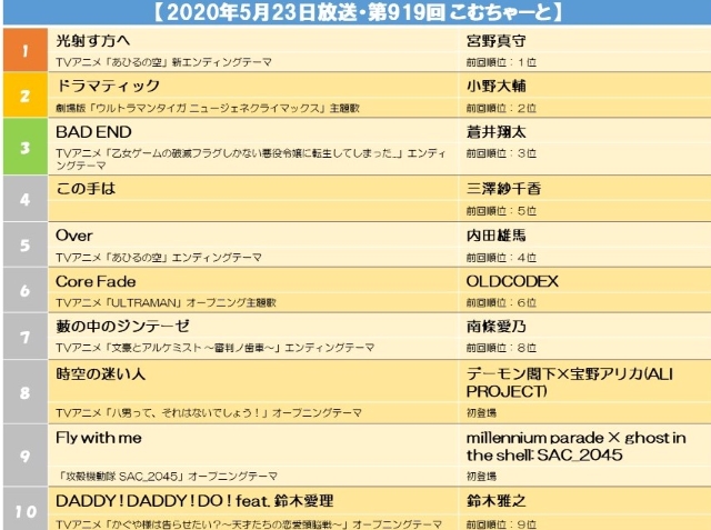 ツイート 2020.05.25 【リクエスト受付中】第919回こむちゃーと振り返り&第920回注目楽曲紹介 次回・5月30日のこむちゃ放送を前に、 前回放送分のこむちゃーとベストテンを振り返ります! 【2020年5月23日放送・第919回 こむちゃーと】 【こむちゃミュージック 新曲インフォメーション】5月30日放送・第920回こむちゃーと対象楽曲の中から、注目のこむちゃミュージック楽曲の一部をご紹介! ≪2020年5月20日 リリース≫◆ Altern-ate- / H-el-ical// (TVアニメ「グレイプニル」オープニングテーマ) ◆ 風吹けば月夜の果てに / A応P (TVアニメ「継つぐもも」オープニング主題歌) ◆ Home/オレンジ・ハート / 春組/夏組 (TVアニメ「A3!」SEASON SPRING&SUMMER エンディングテーマ) ◆ Pride / 遥海 (TVアニメ「波よ聞いてくれ」エンディングテーマ) 楽曲へのリクエストは24時間265日受付中!お葉書でのリクエストは、〒105―8002文化放送『こむちゃっとカウントダウン』リクエストの係り パソコン、スマホからのリクエストは番組のホームページにあるリクエスト専用フォームから送って下さい!番組宛へのメール(comcha@joqr.co.jp)でも受け付けOKです。また、携帯電話の場合は、文化放送の公式携帯サイトからもリクエストが可能です。どんどん送ってくださいね。 リクエストを送って下さった方の中から抽選で10名様に「こむちゃ特製ふせん」をプレゼント!なお、お一人の方の同じ曲へのリクエストは、たくさん投票されても1票とカウントさせていただきますので、ご注意ください!あなたからのリクエストをお待ちしております!! 前の記事