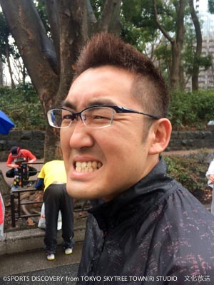 スタート地点(新宿・都庁付近)入りした天海ディレクター。「寒み〜」を連発。いつも中継などではフォローされている砂山アナが、なんちゃってアスリートをかいがいしくフォロー。