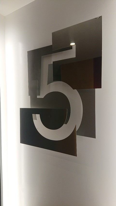また、エレベーターホールにある階数を表わすサインなども町工場によるもので、