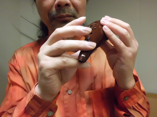 そこで「 右手の薬指と小指 」でオカリナの尻尾を挟んで