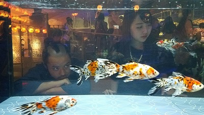 日本最大の金魚展示ゾーン「江戸リウム」は和の雰囲気満載です。リンゴ飴の香りのアロマも焚かれ、こだわっています。