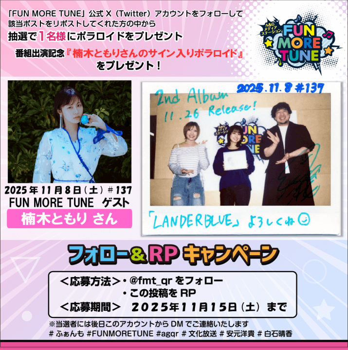 番組ポラロイドが抽選で当たる!「FUN MORE TUNE」公式X(旧Twitter)にてプレゼントキャンペーンを実施中!
