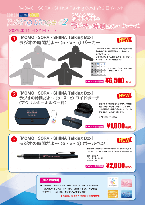 【イベントグッズ&配信チケット情報】11/22(土)開催『MOMO・SORA・SHIINA Talking Box』番組イベント第2弾!