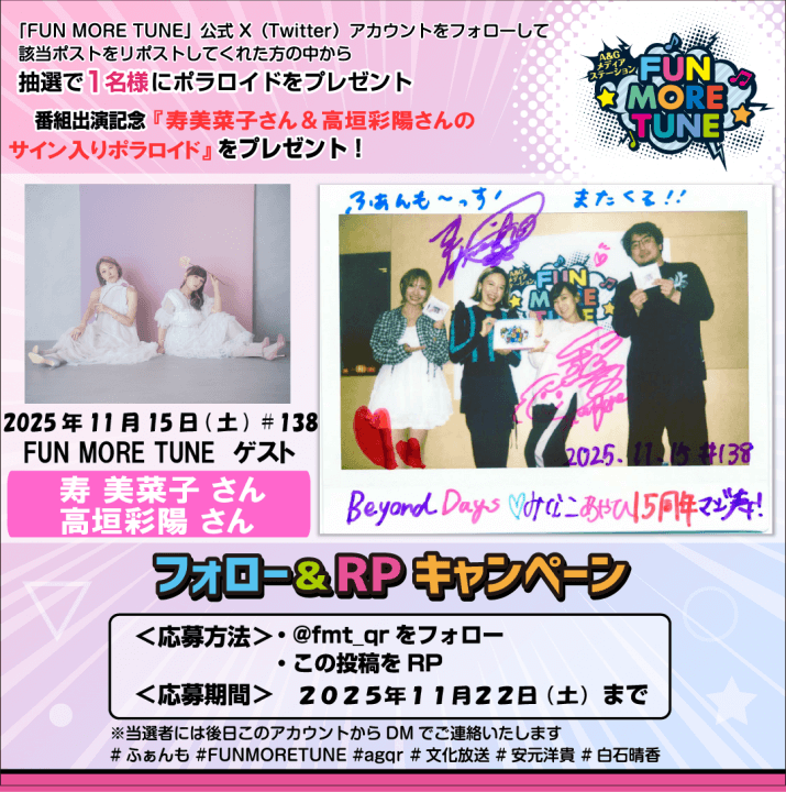 番組ポラロイドが抽選で当たる!「FUN MORE TUNE」公式X(旧Twitter)にてプレゼントキャンペーンを実施中!