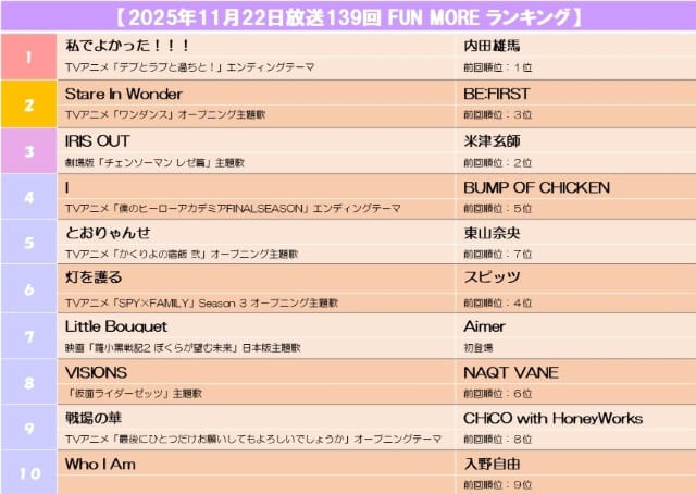 11月29日放送・第139回FUN MOREランキング対象楽曲の中から、