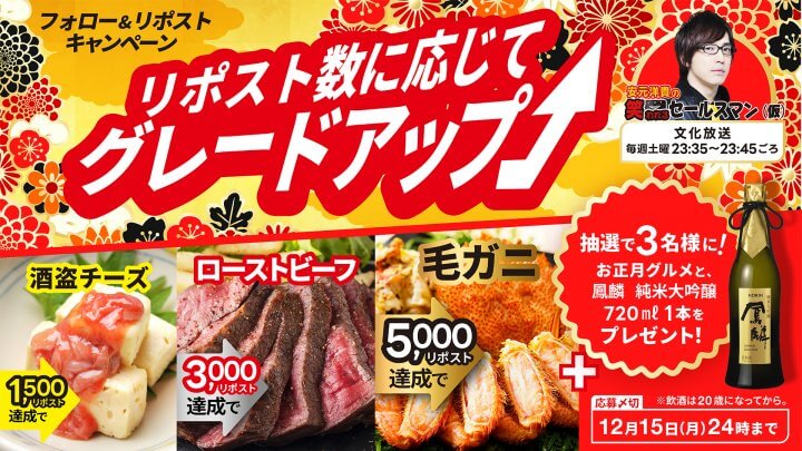 『鳳麟 純米大吟醸』とリポストキャンペーンで決まった豪華グルメをセットにしてプレゼント!