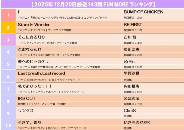 12月27日放送・第144回FUN MOREランキング対象楽曲の中から、