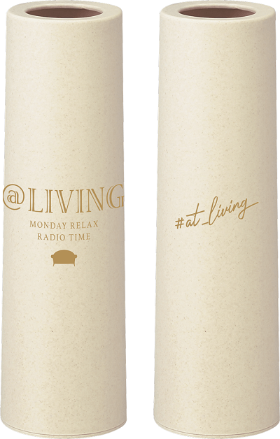 「@LIVING」のデザインがポイントであしらわれたボトル型のティッシュケース。本体色はアイボリーで、自宅だけでなくオフィスにも置けるスタイリッシュなデザイン、バンブーパウダー配合のアイテムです。ティッシュ詰め替えられるので繰り返し使えます。
