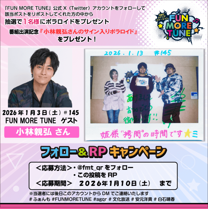 番組ポラロイドが抽選で当たる!「FUN MORE TUNE」公式X(旧Twitter)にてプレゼントキャンペーンを実施中!