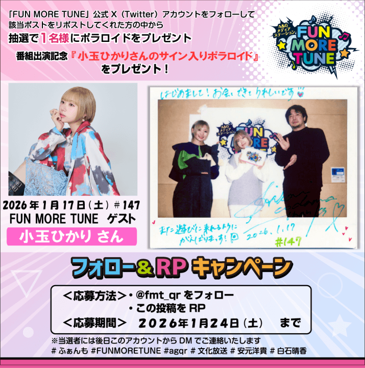 番組ポラロイドが抽選で当たる!「FUN MORE TUNE」公式X(旧Twitter)にてプレゼントキャンペーンを実施中!