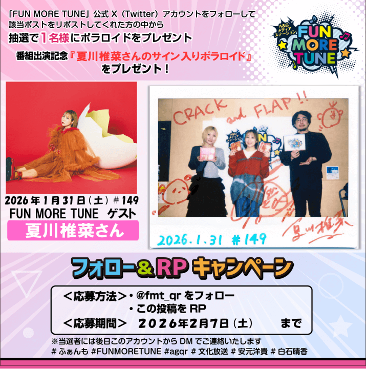 番組ポラロイドが抽選で当たる!「FUN MORE TUNE」公式X(旧Twitter)にてプレゼントキャンペーンを実施中!