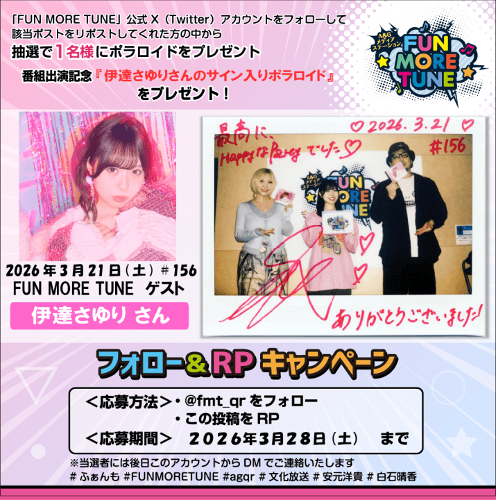 番組ポラロイドが抽選で当たる!「FUN MORE TUNE」公式X(旧Twitter)にてプレゼントキャンペーンを実施中!
