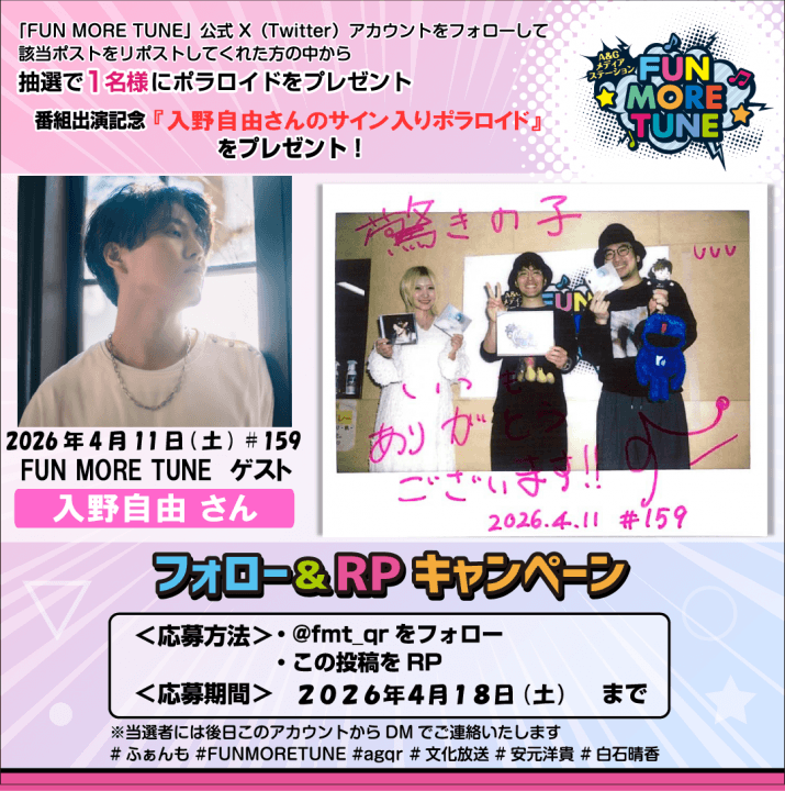 番組ポラロイドが抽選で当たる!「FUN MORE TUNE」公式X(旧Twitter)にてプレゼントキャンペーンを実施中!