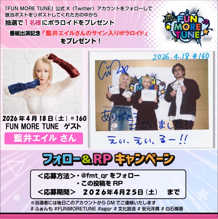 番組ポラロイドが抽選で当たる!「FUN MORE TUNE」公式X(旧Twitter)にてプレゼントキャンペーンを実施中!