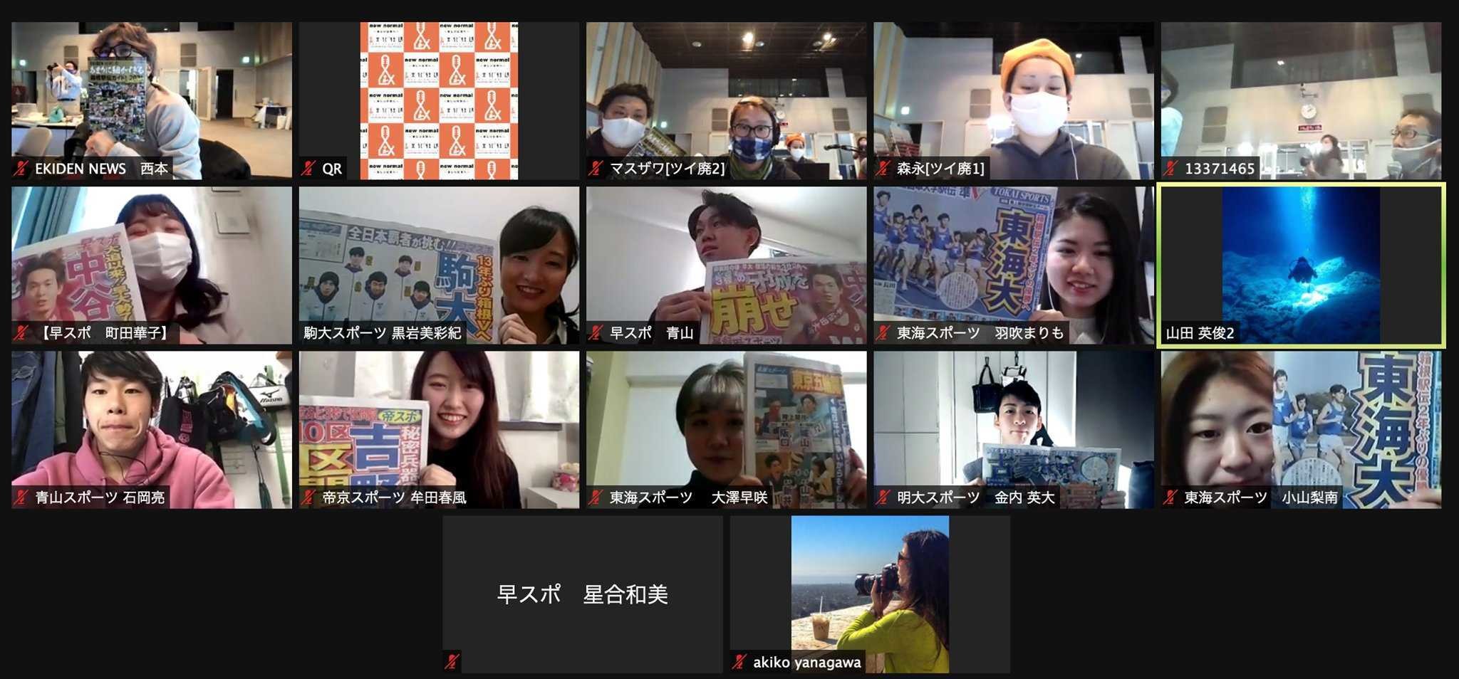 例年でしたら沿道で自校のランナーを取材活動していましたが、観戦自粛のルールに則って、沿道での取材を自粛した学生スポーツ新聞の記者たち。
