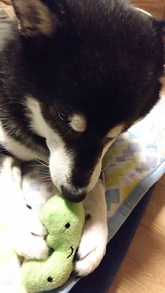 さて今回も紋次郎。「カエル!新しいオモチャ!」