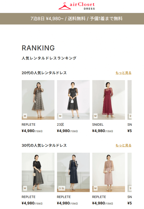 ドレスは一律5,980円で3泊4日レンタルでき、サイズ展開は4Lまでと豊富です。