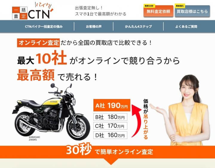 CTN バイク買取一括査定では、オンラインで最大10社の査定額を比較でき、高価買取をしてもらえます。