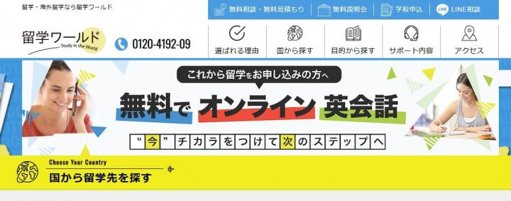 | 留学ワールド by DEOW | ・手数料無料 ・海外の学校とパートナーシップを結んでいる | アメリカ、イギリス、カナダ、フランス、マルタ、アイルランド、デンマーク、フィリピン、マレーシア、台湾、オーストラリア、ニュージーランド |