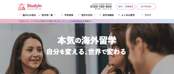 大学・大学院の留学を考えている方には東京大学や早慶などの国内有名大学からの紹介実績が多数あるStudyInがおすすめです。StudyInのコンサルタントは、全員が1年以上の海外留学や就労経験を持っており、実体験に基づいたリアルなアドバイスを受けることができます。また留学前には「レアジョブ英会話」を週3回無料で受講できるため、初心者でも日常会話レベルに到達した状態で留学に備えられます。留学中はLINEにていつでも相談が可能です。