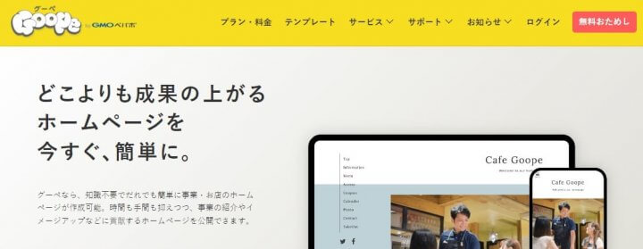 Goopeは、利用者が10万人以上を誇る日本最大級の作成サービスです。ビジネスはもちろんのこと、カフェや保育園など多種多様な業種のホームページが作成できます。