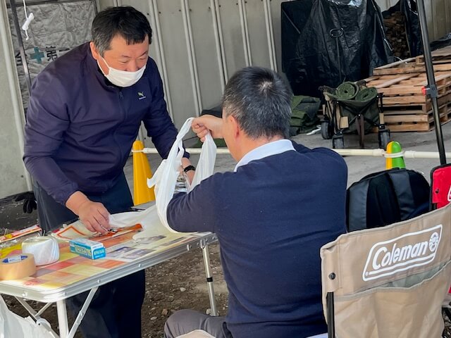 株式会社ネクセライズ防災事業部の皆さんが、実際に来場者の腕にラップや雑誌、ビニール袋を使って応急処置を実演。