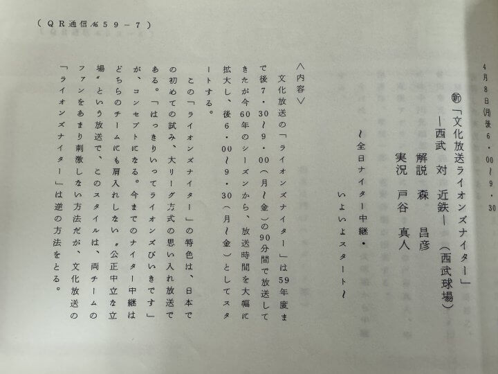 ハッキリいってライオンズびいきです!「文化放送ライオンズナイター」スタート!!【アーカイブの森 探訪記#64】