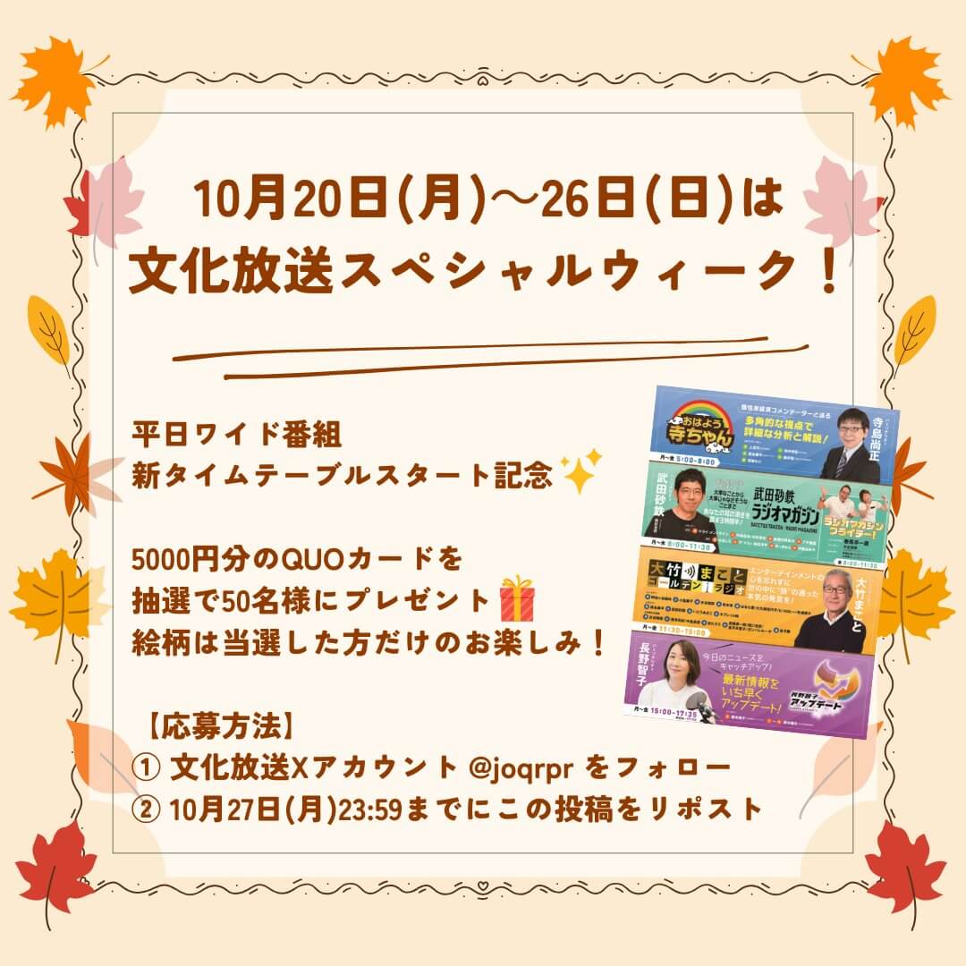 10月20日(月)からの文化放送スペシャルウィークでは、平日ワイド番組の新タイムテーブルスタートを記念して、5000円分のQUOカードを抽選で50名様にプレゼントするキャンペーンを実施します! (※絵柄はお選びいただけませんのでご了承ください)