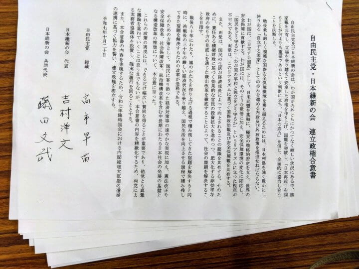 企業団体献金については、継続した自民党と完全廃止を唱える維新はまるで水と油だ。しかし合意文書には「最終結論を得るまでには至っていない」とした上で、企業団体からの献金、政治団体からの献金、受け手の規制など政党の資金調達の在り方について議論する協議体を臨時国会中に設置し、「高市総裁の任期中に結論を得る」とした。