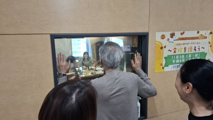 ラジマガのスタジオの窓に張りつく大竹さん。
