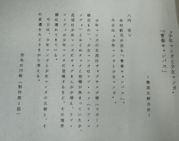 毎週番組内で一つのテーマを設けていたが今回取り上げるのは、マンガをテーマにした一連の放送。いまでは日本の文化の柱ともいえるマンガだが、1980年代前半の当時は大友克洋が出現し、漫画表現が更なる進化を遂げるころ。電車内で漫画雑誌を読むいわゆる「マンガオタク」や「マンガマニア」といった存在が次第に大人になり始めたころだ。マンガをどう受け止めるかで、世代間の価値観すら変わるそんな時期だからこそ、少年ではない若者に向けた番組だったこの番組がマンガを取り扱ったのも自然と言えるだろう。