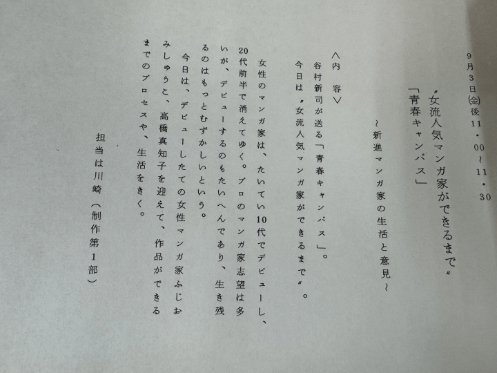 さらに、9月3日に新進の女性マンガ家を迎えた回では、生まれたばかりの作品が読者に届くまでのプロセスや、デビュー直後の生活のリアルが語られた。1980年代と言えば当然、今とは違いメジャーになるには雑誌媒体を通すことしか方法が無かった時期。プロの漫画家を志す少年少女にとって垂涎の内容だったことは想像に難くない。