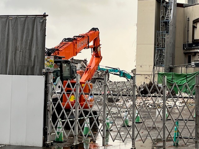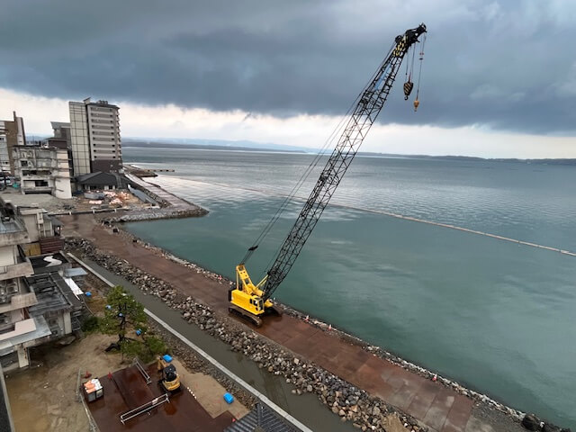公費解体は終わったと言われていますが、まだ解体されていなかったり解体途中の家もあります。和倉温泉に行くと、護岸沿いに仮設道路を作り、護岸の修理や建物の解体など大規模な工事が進められていました。私が泊まった部屋からも工事の様子がよく見えます。