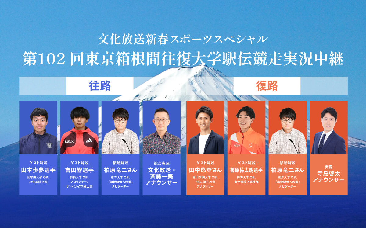 【102箱根駅伝】文化放送の解説は柏原竜二氏、吉田響選手、山本歩夢選手、田中悠登アナウンサー、篠原倖太朗選手に決定!