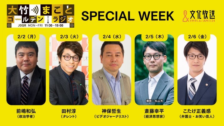 2/5(木) コトブキツカサ(映画パーソナリティー)・佐藤大介(週刊新潮デイリー新潮編集長)・竹田聖 (週刊文春編集長)/藤井聡(京都大学大学院教授)