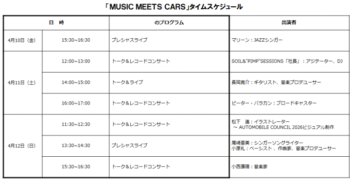 毎年、注目をいただいている、音楽プログラム「MUSIC MEETS CARS」のタイムスケジュールのお知らせです。アーティストのライブを間近でお愉しみいただく「プレシャスライブ」、DJやブロードキャスター、音楽家などの選曲によるドライブミュージックを中心として、レコードコンサートとトークをお愉しみいただきます。ご来場いただいたどなた様も観覧いただけるプログラムです。