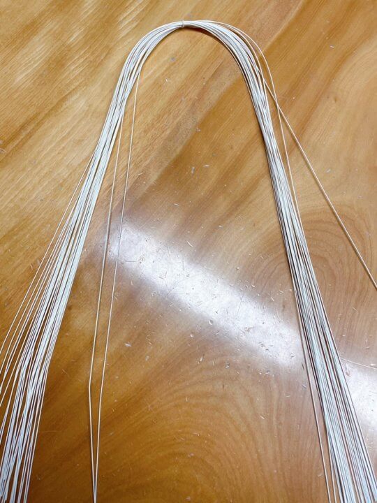 そのこよりを100本以上まっすぐに張り、その一本一本の間に布を挟み込みます。