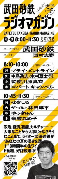 フリーライターの武田砂鉄が生放送でお送りする朝の生ワイド「武田砂鉄ラジオマガジン」(文化放送)。
