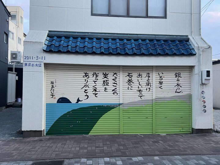 銀玉水さんのシャッターに描かれたたい平さんの絵。