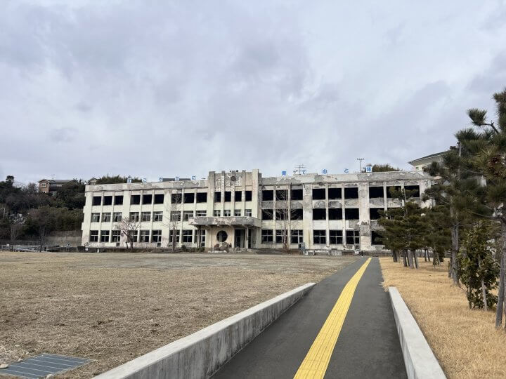 震災遺構となっている門脇小学校のリチャードさん!