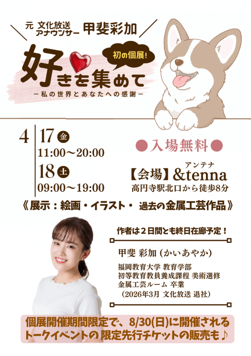 まずは4月17日(金)、18日(土)高円寺の&tenna (アンテナ)にて甲斐彩加さんの個展が開かれます。入場無料で甲斐ちゃんスマイルもプライスレスです。是非お運びください。
