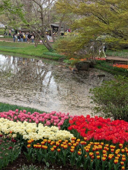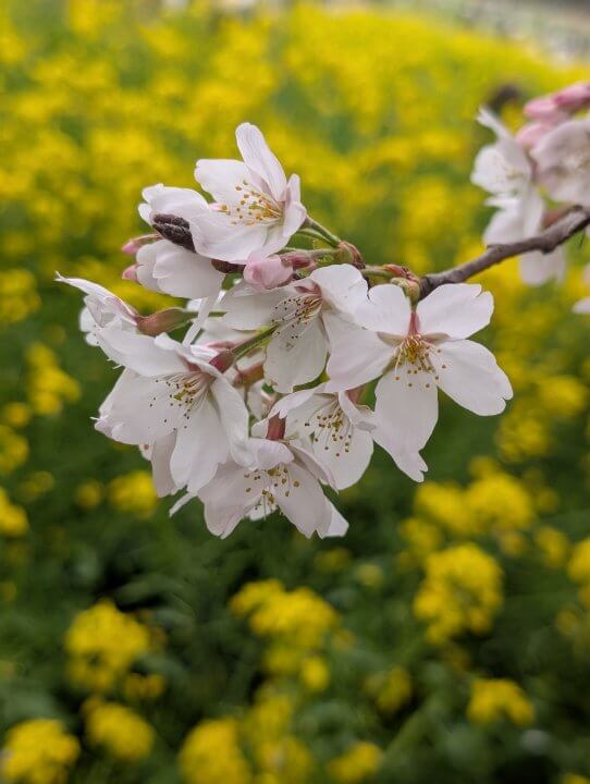 思ったよりソメイヨシノの花が残っていて、菜の花との共演が美しかったです。チューリップも咲きそろってきて、ソメイヨシノの花筏とのコントラストも綺麗でした。