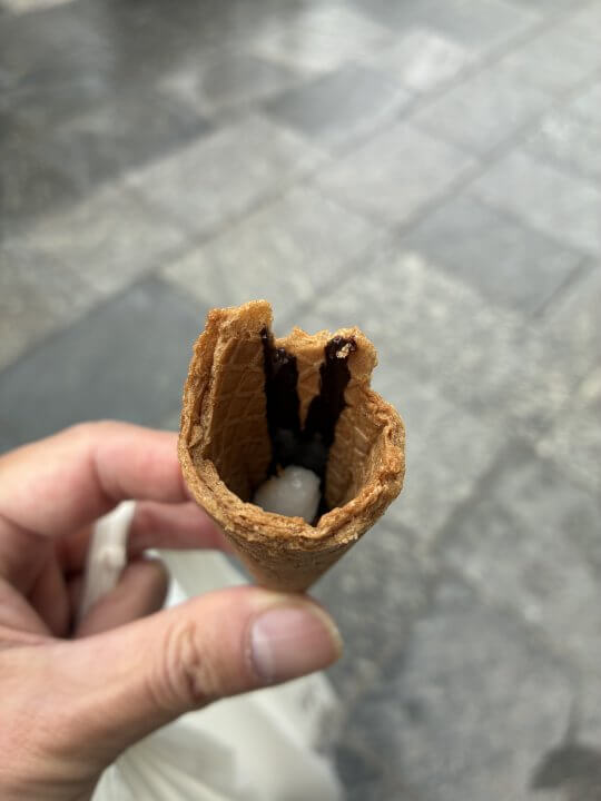ジェラートをほぼ食べ終わったコーンの内側に、チョコレートが貼り付いているのです。