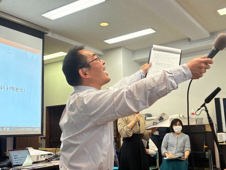 CMは3人一組でそれぞれ役柄を演じてもらうもので、まずは先生が見せたあとで生徒さんが実演。皆さん声色やトーンをうまく変えて演じていました。スポーツ実況は、WBC日本ラウンドで大谷翔平選手がホームランを打ったシーンを実況してもらいましたが、情景を描写しながら雰囲気を盛り上げて実況できていました。